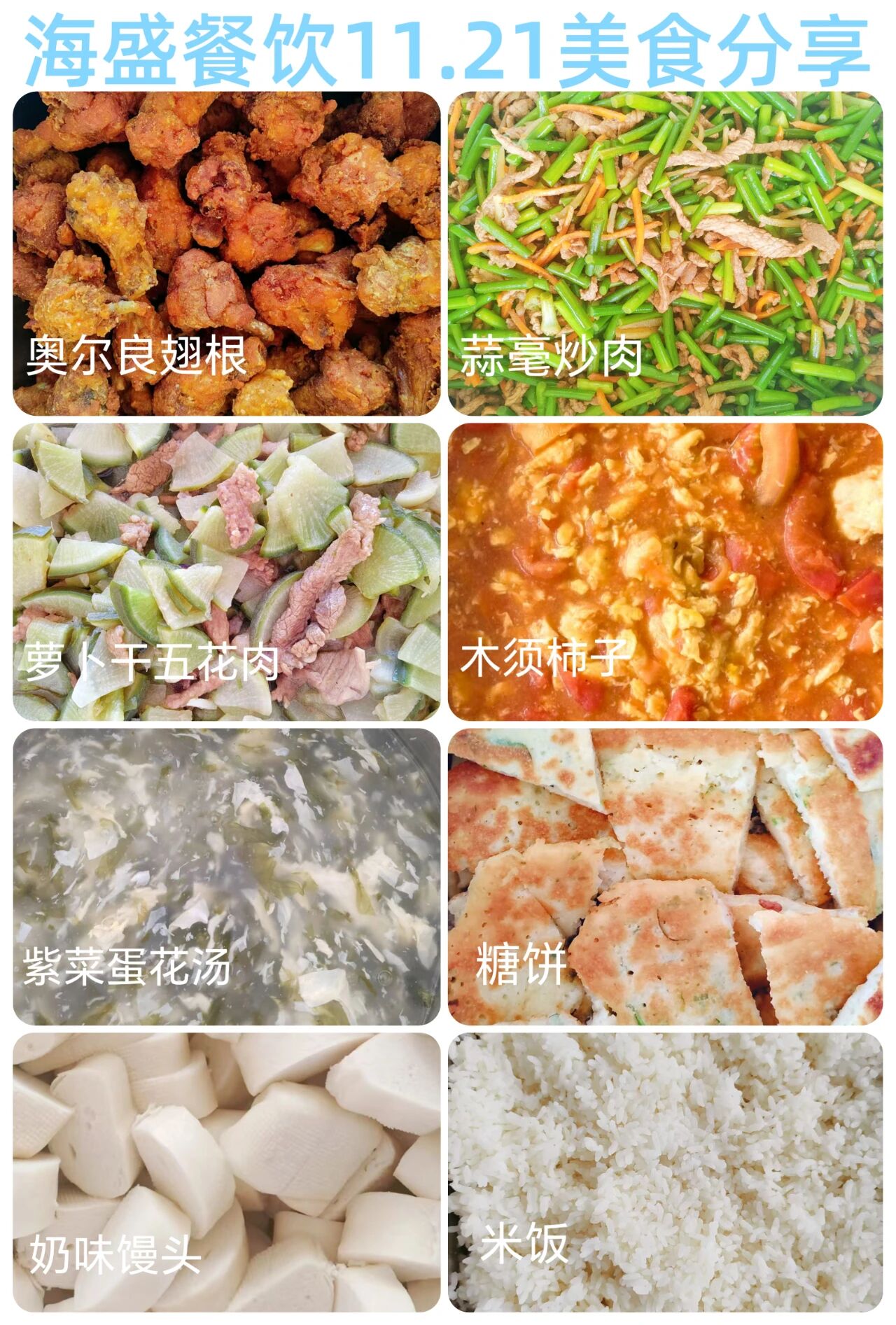 今日美食: 奥尔良翅根 蒜毫炒肉 萝卜干五花肉 西红柿炒鸡蛋 紫菜蛋花汤 今日主食: 糖饼 米饭 奶香馒头
