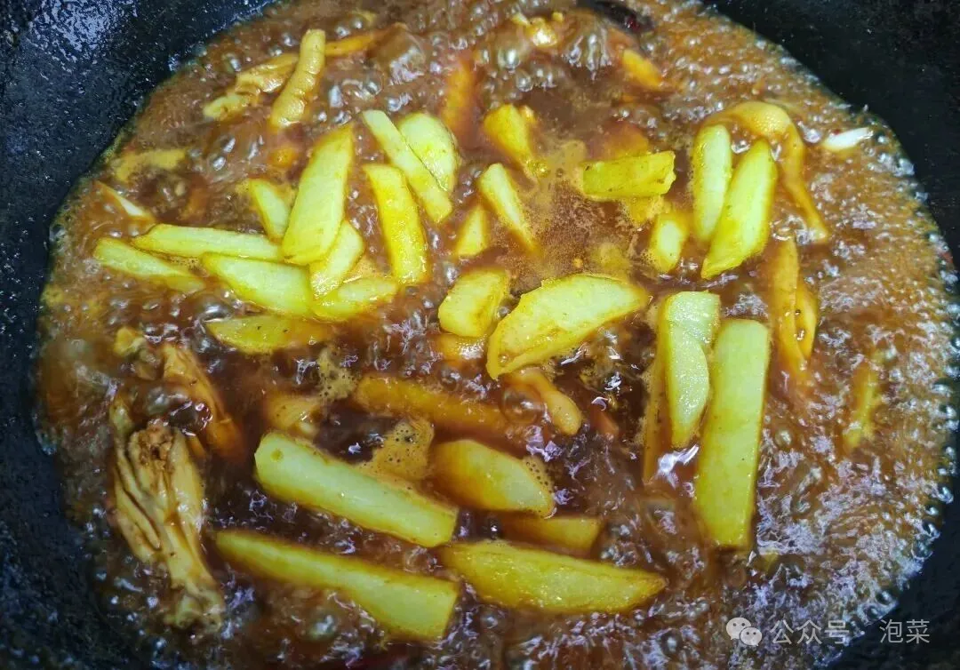 然后加开水 , 水量没过食材就行 , 把煎好的土豆也放进去。