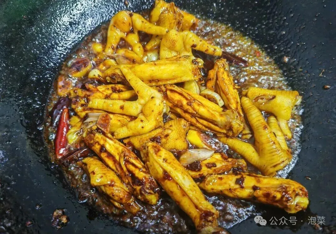 把焯好水的鸡翅鸡爪倒进去 , 再把调好的酱汁也倒进去 , 大火翻炒均匀。