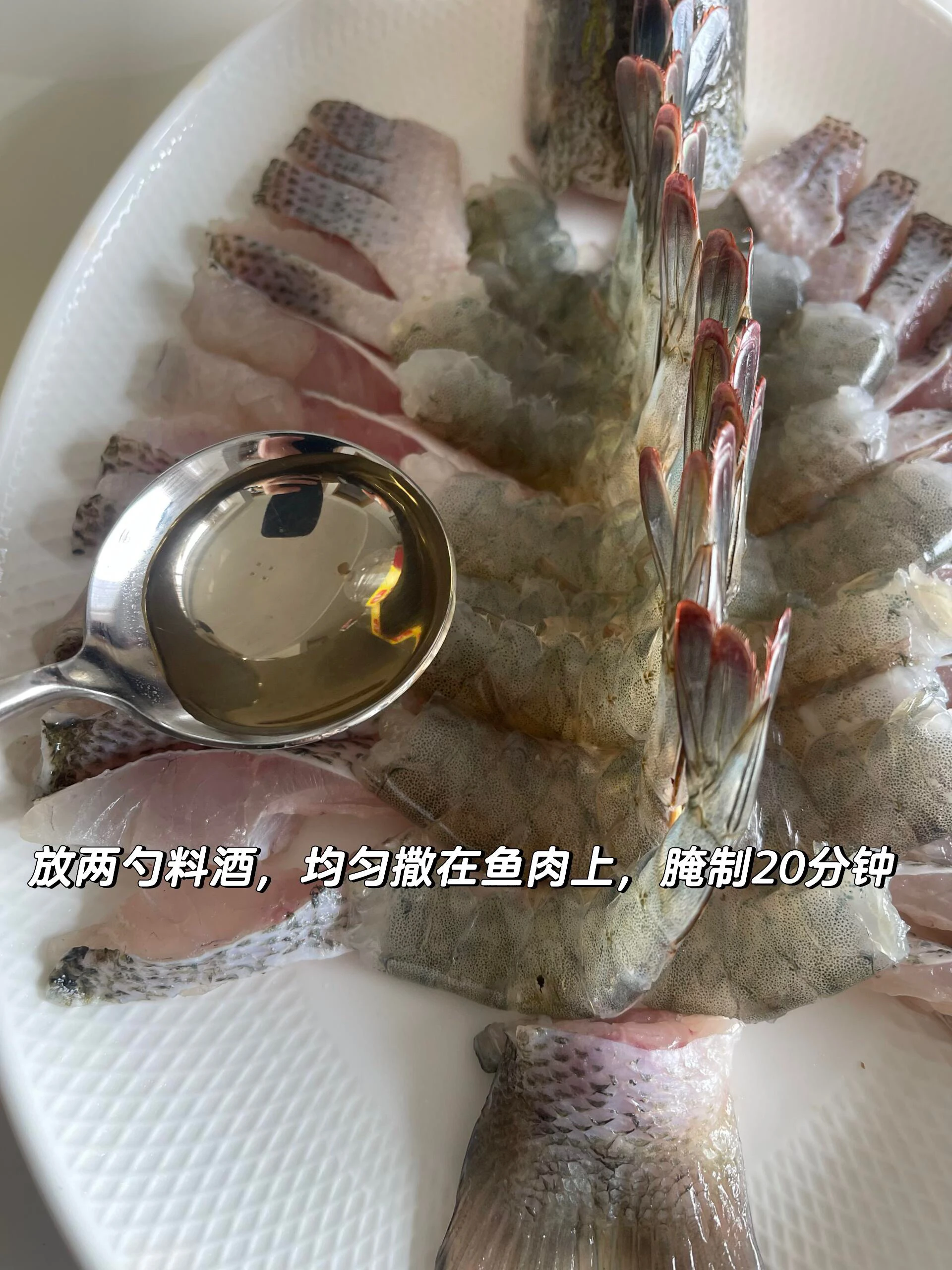 2、放两大勺料酒,均匀倒在鱼肉上腌制20分钟。