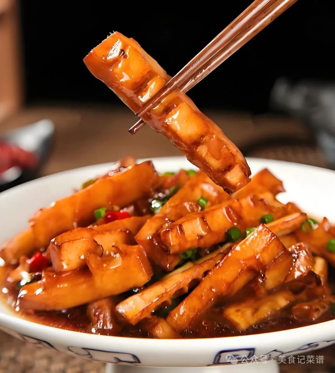收汁要彻底:油焖春笋讲究“汁浓裹笋”,汤汁要收得干干的,只剩下油亮的酱汁挂在笋上,这样吃起来才够味。