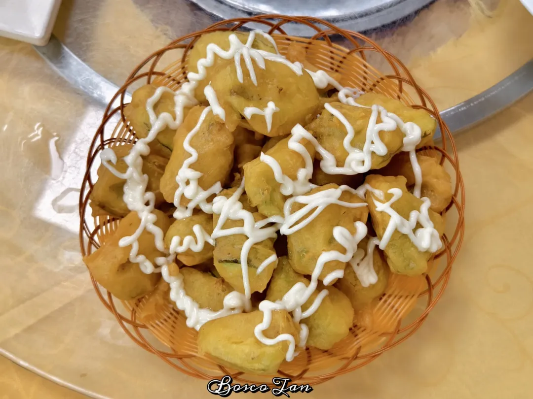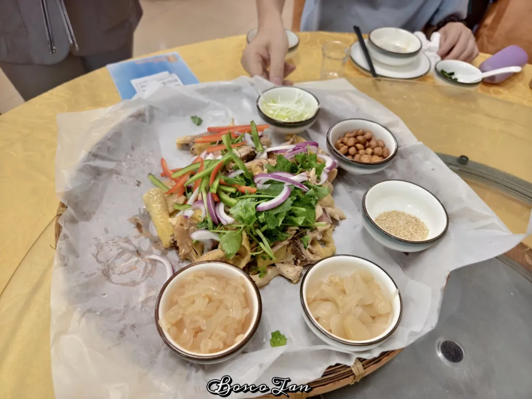 南国桃园这边真没什么好吃的,要不就是倒闭了,要不就是看着脏兮兮不敢进去吃。最后找到这家看起来不错的饭店。点了一份招牌七彩捞鸡、一份冰川茄子、一份黑豆腐、一份上汤枸杞叶。上菜速速快,份量适中,茄子原来是炸的,蘸的是沙拉酱,第一次这样吃,挺好吃的,但是吃多了会腻。鸡是饭店自己饲养的,肉质不错。这个黑豆腐一点都不黑。总体来说挺不错的,唯独不好的是环境,大厅还是有不少人抽烟,只能开大点风扇吹走它们。