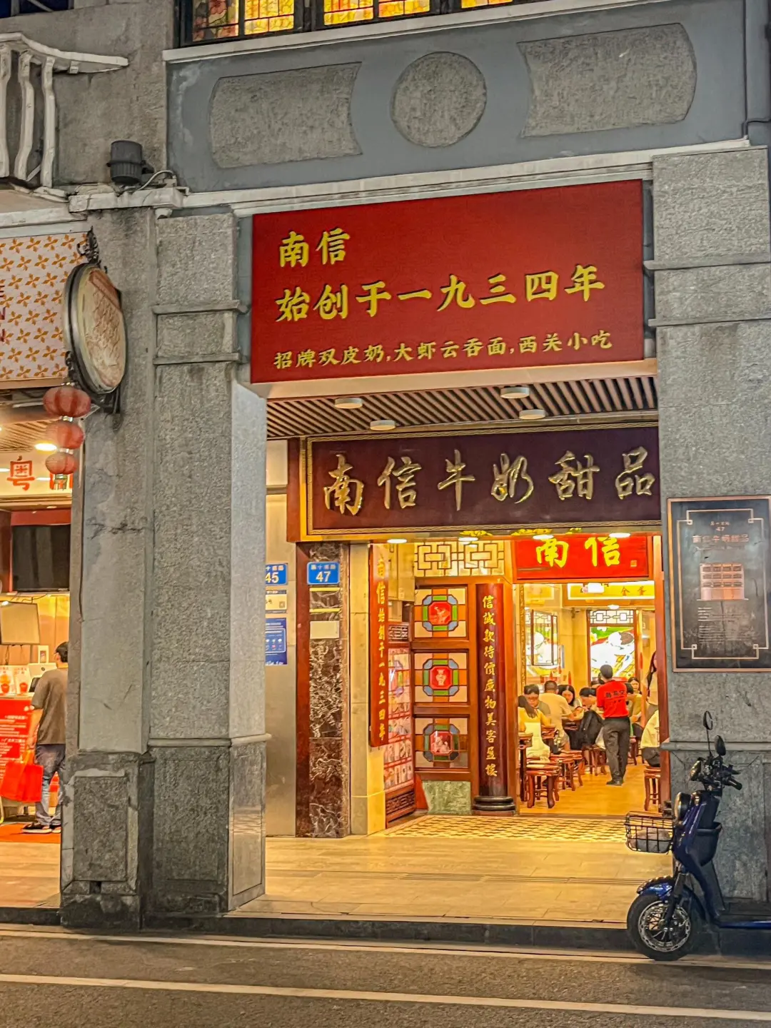 在荔湾区第十甫路的骑楼街巷中,藏着一家飘香近百年的老字号——南信牛奶甜品专家。自1934年创立以来,它已成为西关美食记忆中不可或缺的甜蜜符号。店内的糖水以地道美味著称,“水牛奶蛋白杏仁露汤圆”将奶香与杏仁香完美融合,汤圆浸润其中,口感十分丰富。招牌红豆双皮奶与姜撞奶也是不容错过的美味,姜汁与高温水牛奶在碰撞的瞬间凝结成膏,辛香与温甜完美平衡。在这里,还能品尝到清新脆爽的椰汁马蹄爽、水牛奶炖木瓜桃胶、椰奶红豆冰雪糕等广府美味。值得一提的是,店中的咸品小食也颇具水准,形成了独特的“甜咸搭配”体验。若想体验地道的广式糖水文化,来这座“甜品博物馆”就对了~