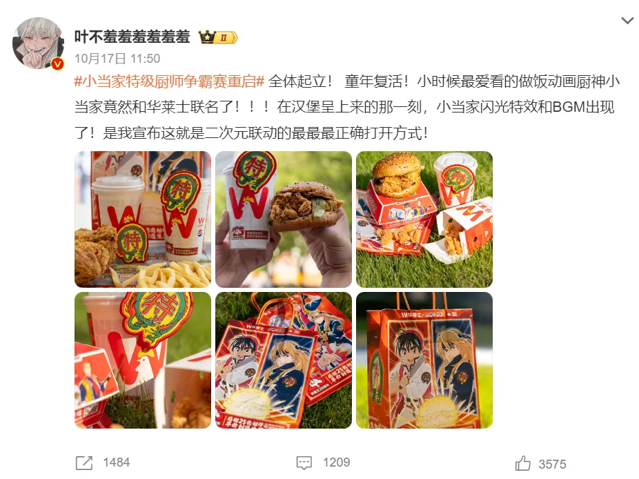 第一种联名对象就是虚拟IP,比如与动漫、电影、游戏、文学等IP合作。这是目前最常见、最成熟的联名方式。华莱士与《厨神小当家》《新大头儿子》的联名便是深入到动漫这条赛道中,联名物料通常以立牌、徽章、包装袋、角色卡等为主。