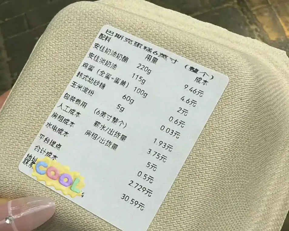 不久前,“店主直接把小蛋糕的成本都写上了”的词条冲上热搜。南京一家蛋糕店在包装上详细列出了原料、房租、人工等成本——6英寸的巴斯克蛋糕售价39元,总成本为30.59元,其中包含原料成本16元、运营成本14.59元,利润约为8.41元。
