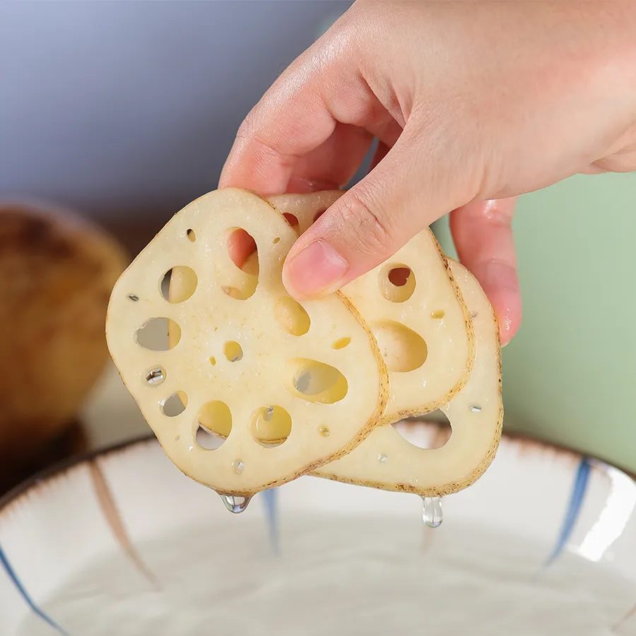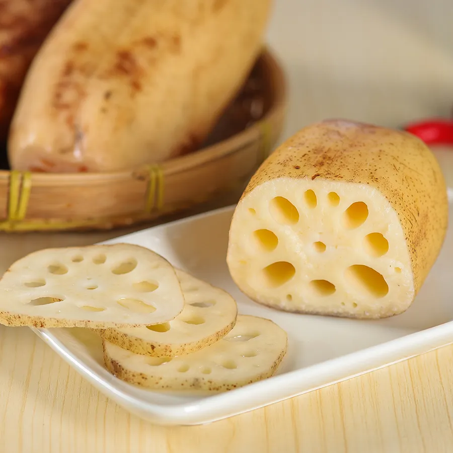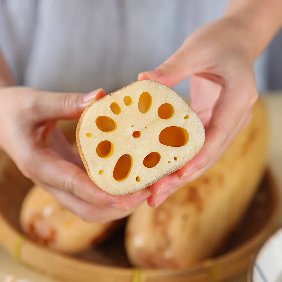 其皮薄细长,肤白肉厚,去皮之后的莲藕雪白凝脂,光是看看就非常细腻甘甜的感觉。