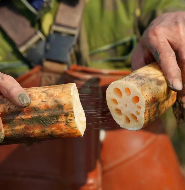 小心翼翼地将粉藕拉出,一但藕被折断,基本就不值钱了,所以需要师傅凭借丰富的经验,判断准确莲藕的长势和方向,再小心翼翼地挖出。