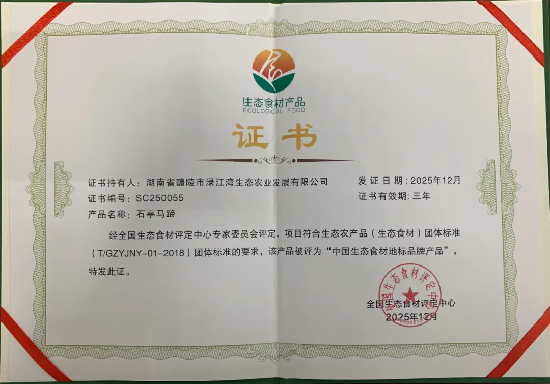 2025年12月,经全国生态食材评定中心考察评审批准,湖南省醴陵市渌江湾生态农业发展有限公司申报的石亭镇特色农产品——石亭马蹄被评为“中国生态食材地标品牌产品”。
