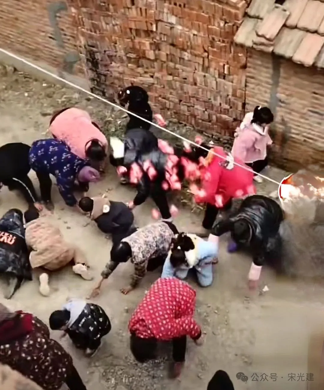 那一刻,所有的孩子、大人一起参与,我们看着糖块抛洒下来的方向,一起冲过去,有时候能抢到一两块,有时候一轮下来一块也抢不到,人太多了。糖根本不够抢的!有的时候即便只抢到一两块也很开心。但是看到同伴如果抢到很多,还是很羡慕的。我们小孩子争先恐后地趴在地上抢夺。糖块那甜蜜的滋味、花生的香脆、枣的清甜,让我们忘记了地上的冰冷刺骨。