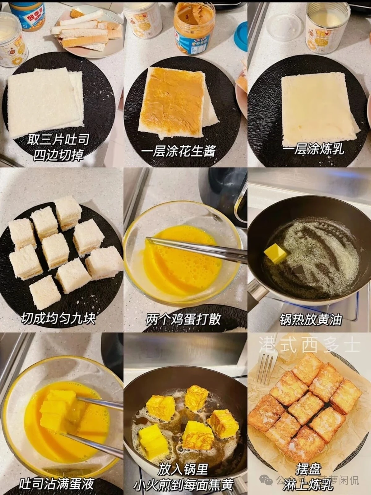 2⃣️ 取一片涂上花生酱,再一片涂上炼乳,最后一片盖上,切成九宫格