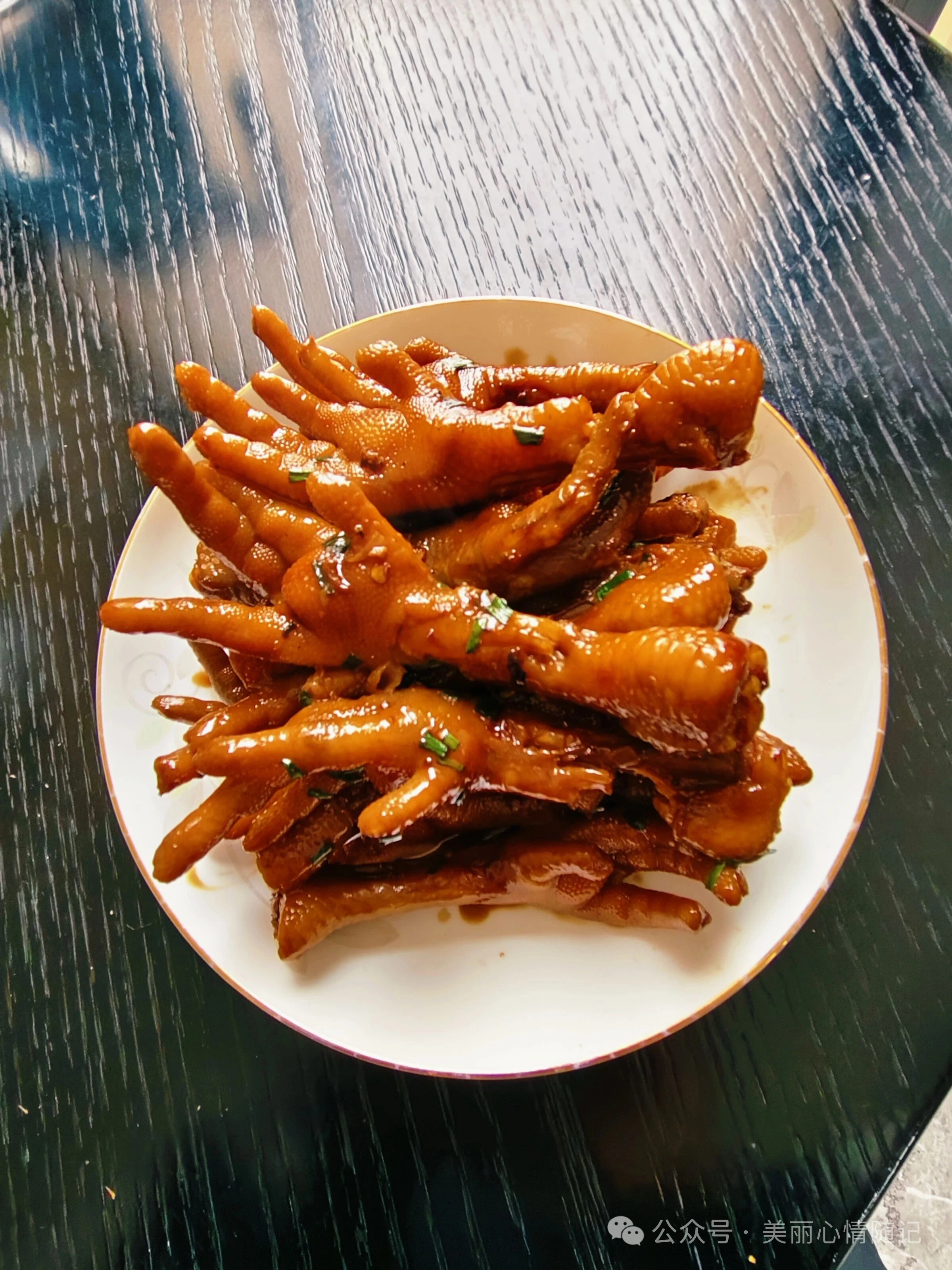 1.2.热锅里放油,放适量姜、大蒜🧄瓣及1个干辣椒(怕辣可不放),出香味后放入鸡爪翻炒,再放酱油(鲜酱油+老抽一点点),冰糖,再加水(漫过鸡爪即可)中火煮,大火收汁时放点葱末,再装盘,美味的鸡爪就做好啦(图1)。
