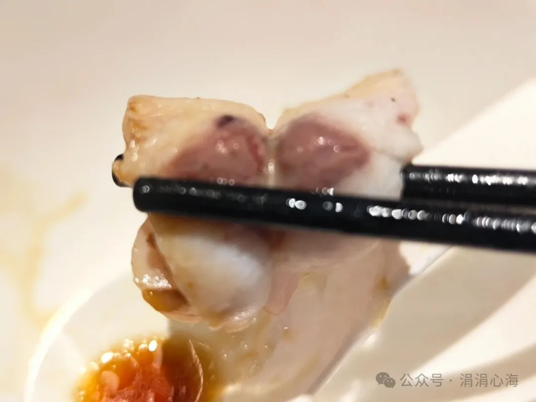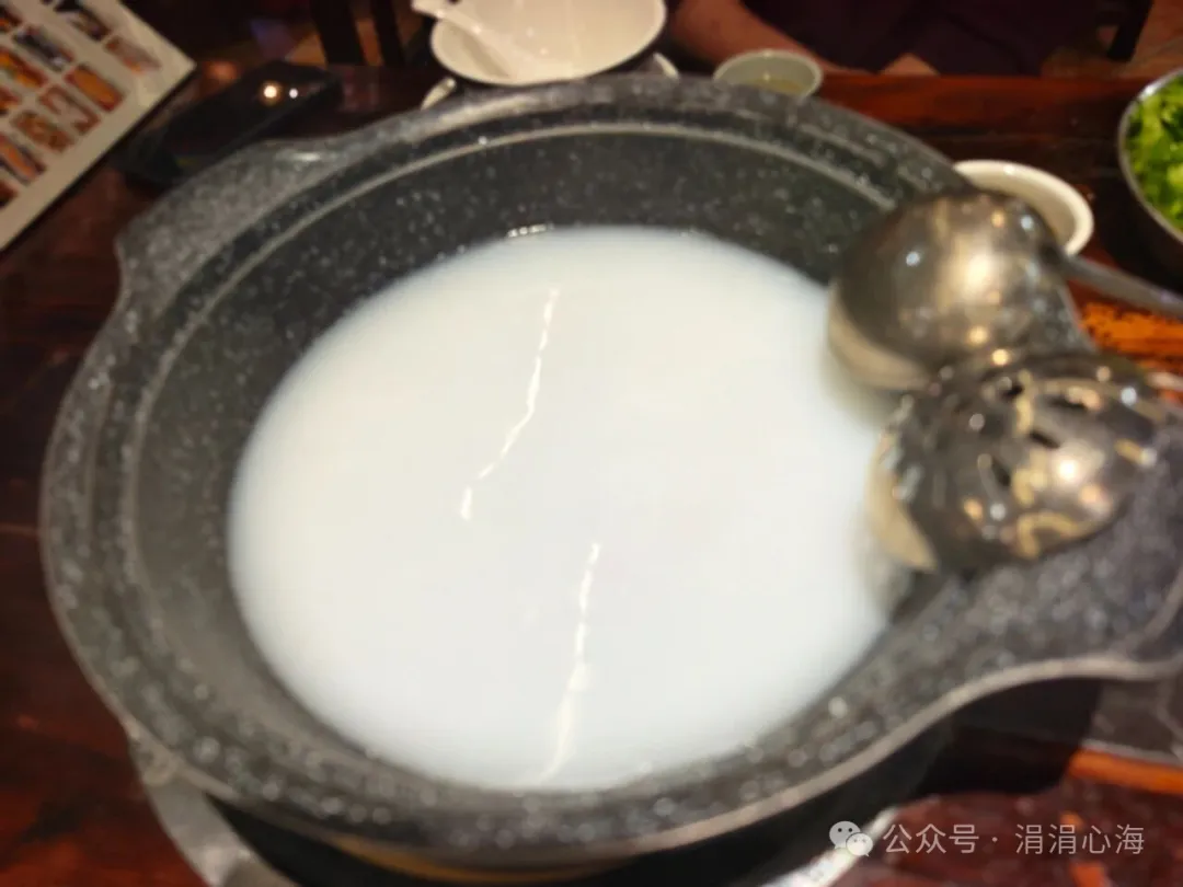 锅里的粥底早已滚沸,我们赶紧品尝起来,在粥水里刷过的鱼片很鲜嫩,味道确实不错,那点鱼片很快就刷完了,但迟迟不见服务员再上鱼片。