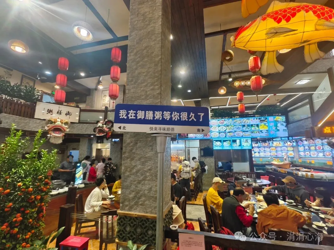除了气派的门面,吸引我的还有门店上的那些醒目的大字招牌,只见上面写着“中华餐饮名店”“顺德御膳”,在门店外墙正中,“御膳粥”三个大字尤为抢眼。