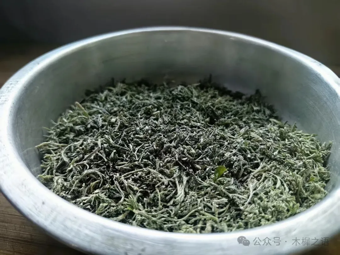 除了晒干泡水喝,茵陈麦饭是人们最常吃的做法,茵陈比较有韧性,切起来有些吃力,这就要考验刀锋是否锋利了。