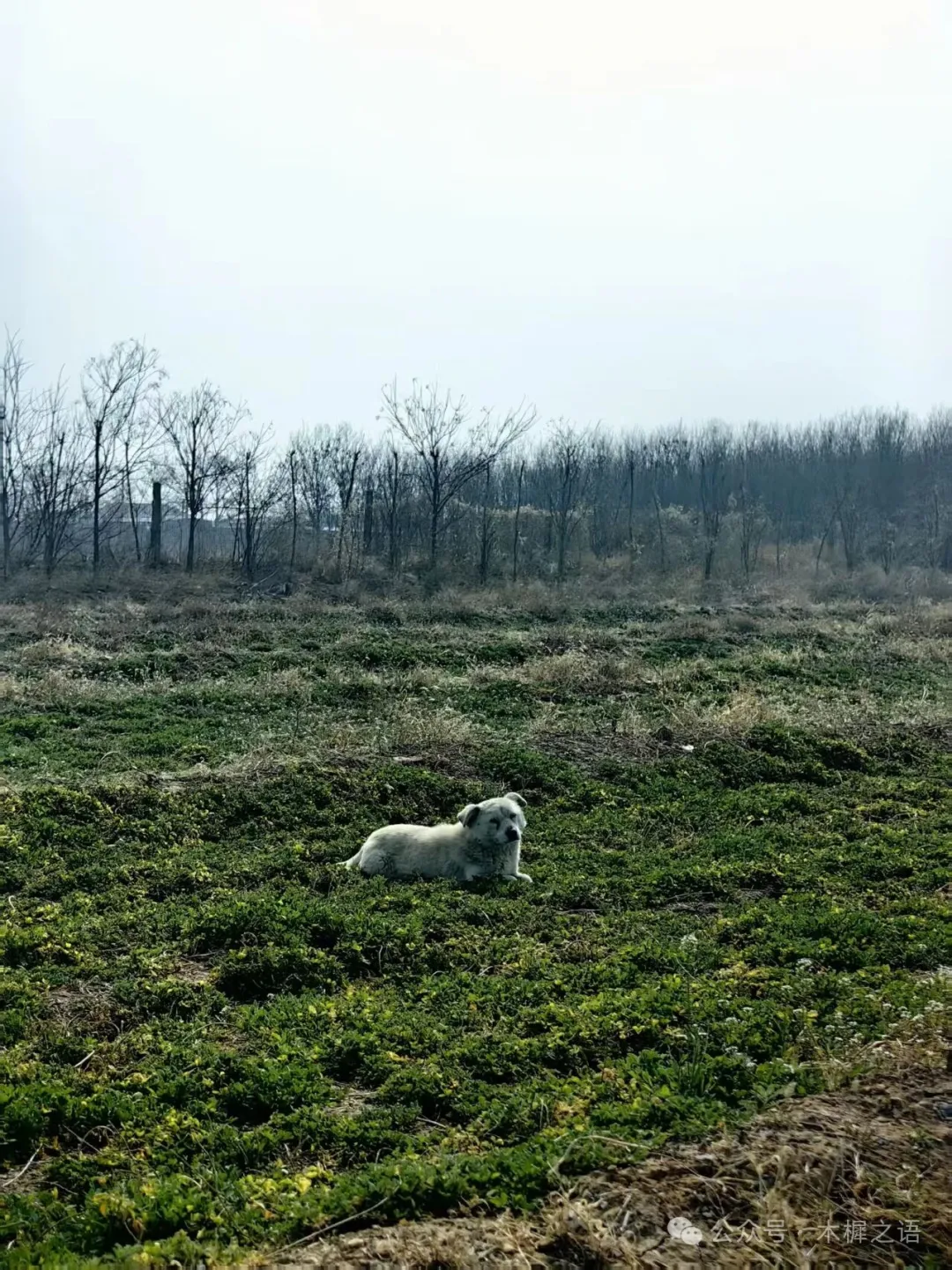 一只白色的小狗以一种最为舒服的姿势卧在被镀上一层金光的苜蓿地里,安静地看着我们惬意地忙碌。
