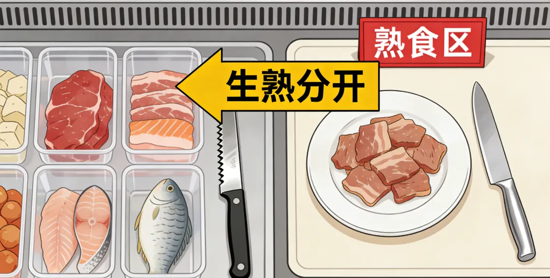 严格区分生食与熟食、原料与成品,在加工、贮存过程中实现物理分离。需配备专用工具、容器,并明确操作区域。食品安全管理人员应监督全过程,确保分离原则执行到位。