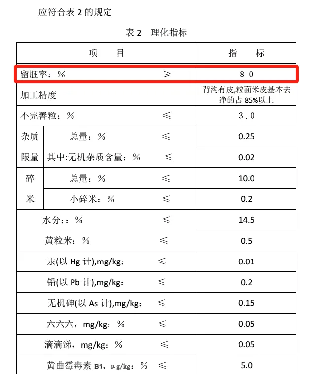 根据国家营养学会制定的胚芽米标准,留胚率必须在百分之八十以上的大米才可以称之为胚芽米。但是,如按国家标准等级精度米的常规生产工艺,其胚芽保留量率百分之三十都很难做到。