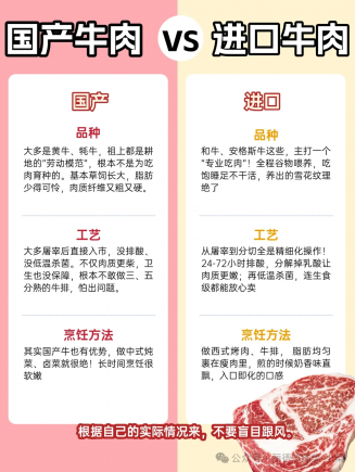 国产牛肉:大多屠宰后直接入市,没排酸、没低温杀菌。不仅肉质更柴,卫生也没保障,根本不敢做三、五分熟的牛排,怕出问题。