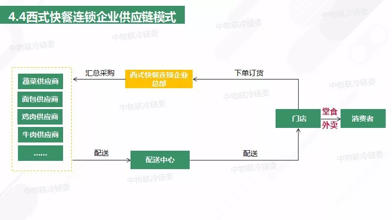 与中式快餐相比,肯德基、麦当劳等西式快餐食材标准化程度高,因此对供应链需求相对简单。而且,由于西式快餐主要聚焦在汉堡、薯条、鸡块等品类上,因此对于食材多元化品类的采购需求远低于中餐市场,其供应链模式也较为简单。 连锁餐饮门店向总部下单订货,总部汇总采购蔬菜、肉制品等食材,并由食材供应商通过配送商配送到各个门店。由于模式相对简单,因此对于食材供应链的需求相对较弱,主要聚焦在食材的品质选择与冷链物流体系的考察上。目前,模式相对成熟的西式快餐食材供应商有大成食品、圣农食品等。