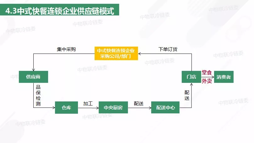 中式快餐连锁门店向总部、采购部门下单,将需求告知,采购部门通过从供应商处集中采购,将产品配送至中央厨房进行加工,再由配送中心输送到各个门店。由于小型餐饮连锁的标准化程度较低,往往通过自采自卖的方式进行产品加工销售,对供应链的需求较小,因此,这 种模式主要适用于大中型中式快餐连锁,比如真功夫旗下供应链功夫鲜食汇等。