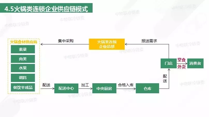 火锅餐饮企业与供应链的合作模式与中式快餐相差不大,火锅本身也是从中餐市场细分出来的餐饮业态。火锅餐饮连锁门店将食材需求上报至总部,再由总部集中采购后配送至配送中心,再由配送中心集中配送到中央厨房进行加工,加工后通过仓库检查,合格的产品配送 到各个门店。随着火锅市场的多元化发展,不少企业专业生产毛肚、腐竹、竹笋、虾滑等大单品,火锅餐饮企业对食材品类的需求也不断细化。目前,在业内相对成熟的火锅食材供应链企业有当餐等。