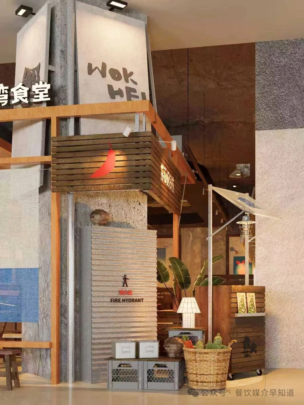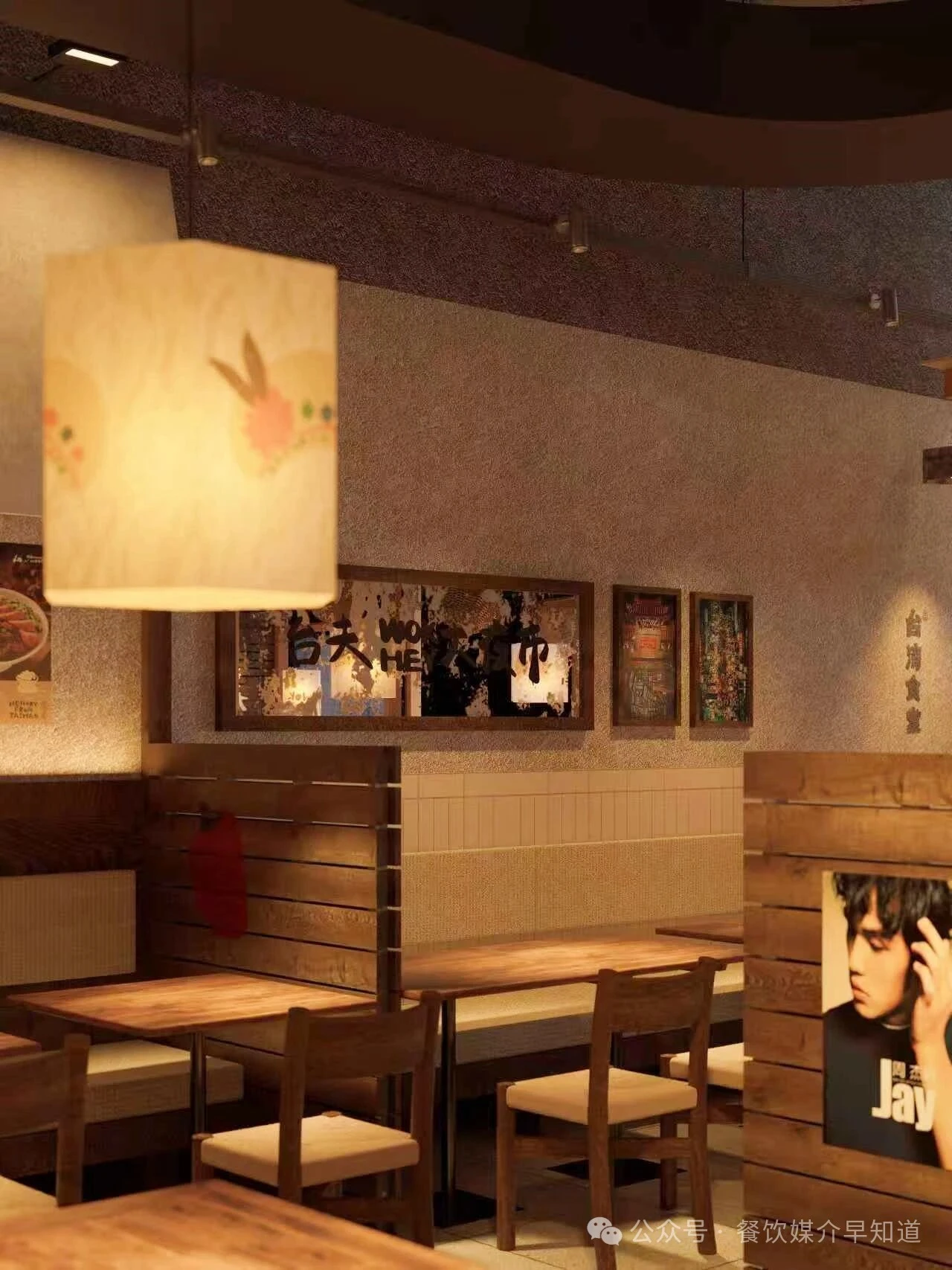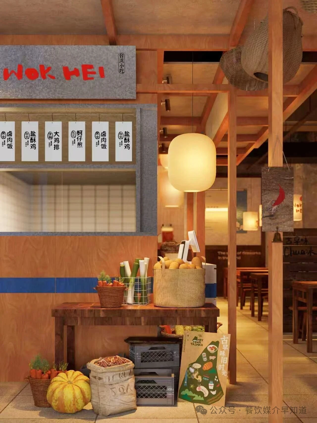 从台湾街头与食堂中提炼符号,进行美学转译。粗糙的墙面、复古花砖、手写菜名牌(蚵仔煎、卤肉饭、盐酥鸡)与木质桌椅,共同搭建起记忆的基底。周杰伦海报的巧妙置入,瞬间锚定了时代的共同情感,将怀旧从“泛泛的过去”精确到一代人的青春记忆。红色塑料筐、竹篮、麻袋等市井容器被提升为装饰元素,诚实且富有美感地陈列着食材与生活痕迹。