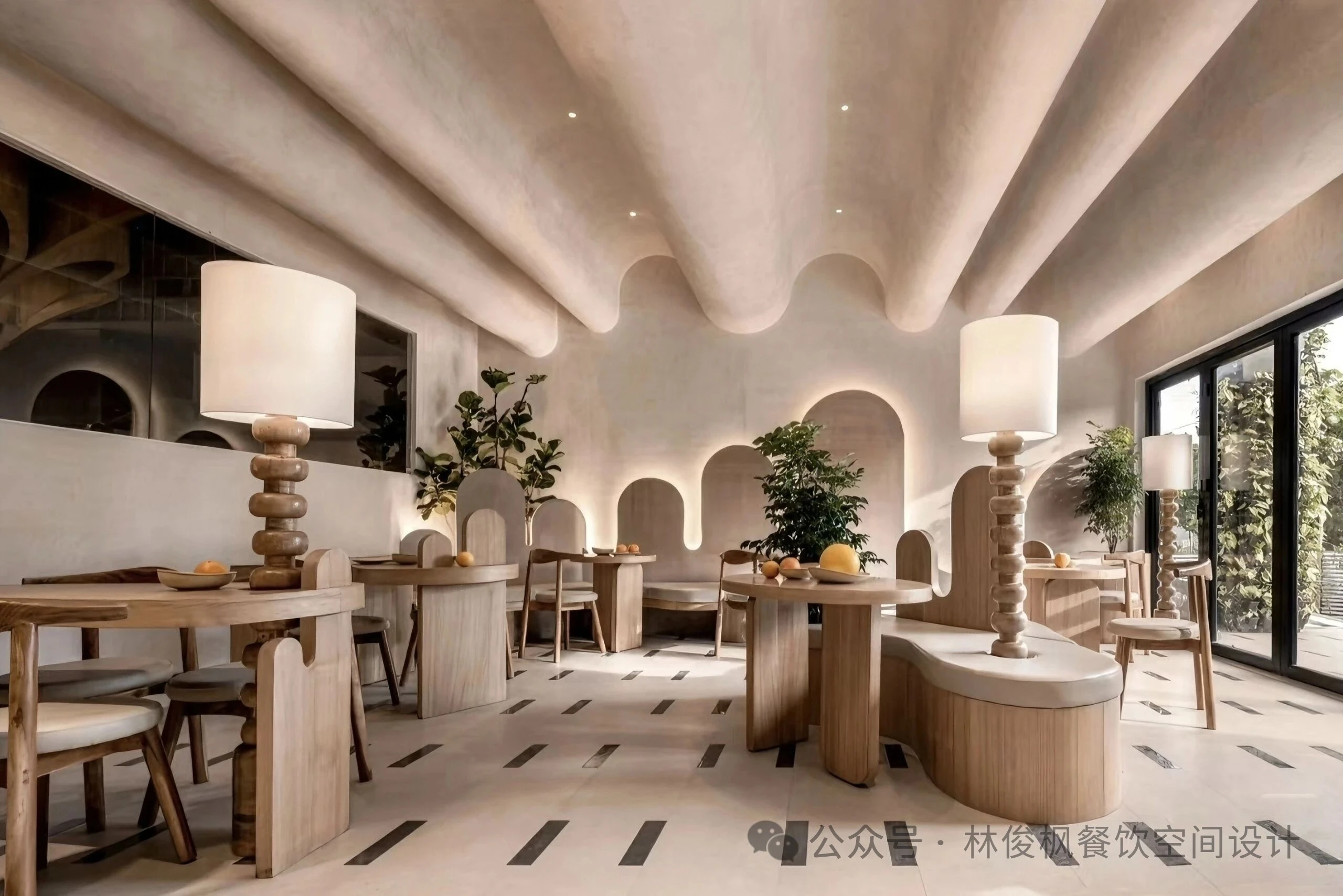 贯穿整个空间的波浪形穹顶与柔光灯带,搭配米杏色与暖木的温润色调,营造出一种既质朴又精致的沉浸感。从门头到前厅再到用餐区,每一处转角都有不同的视觉惊喜,让顾客忍不住拍照分享,为门店带来持续的社交流量,复购率提升32%。
