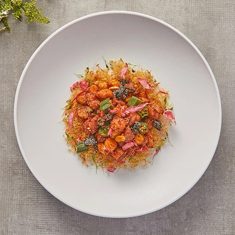 2. 鸡腿肉用醃料醃制5分钟后炸香,山药粒及秋葵粒炸香,煸香小料后下主辅料煸透至香,加入金马酱翻炒均匀,撒上装饰即可。