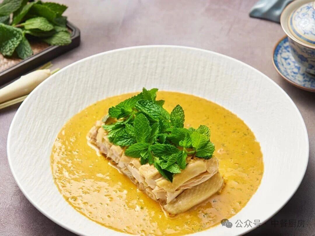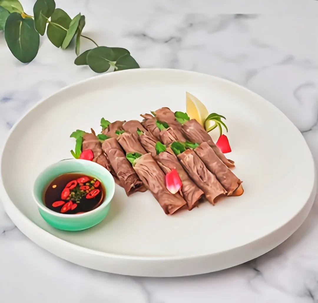 3.捞出牛腱,放入冰箱冷藏一个小时,将牛腱切成薄片,卷上薄荷叶,摆入盘中,配上用调味料调制好的酱汁(每份30克)即可。