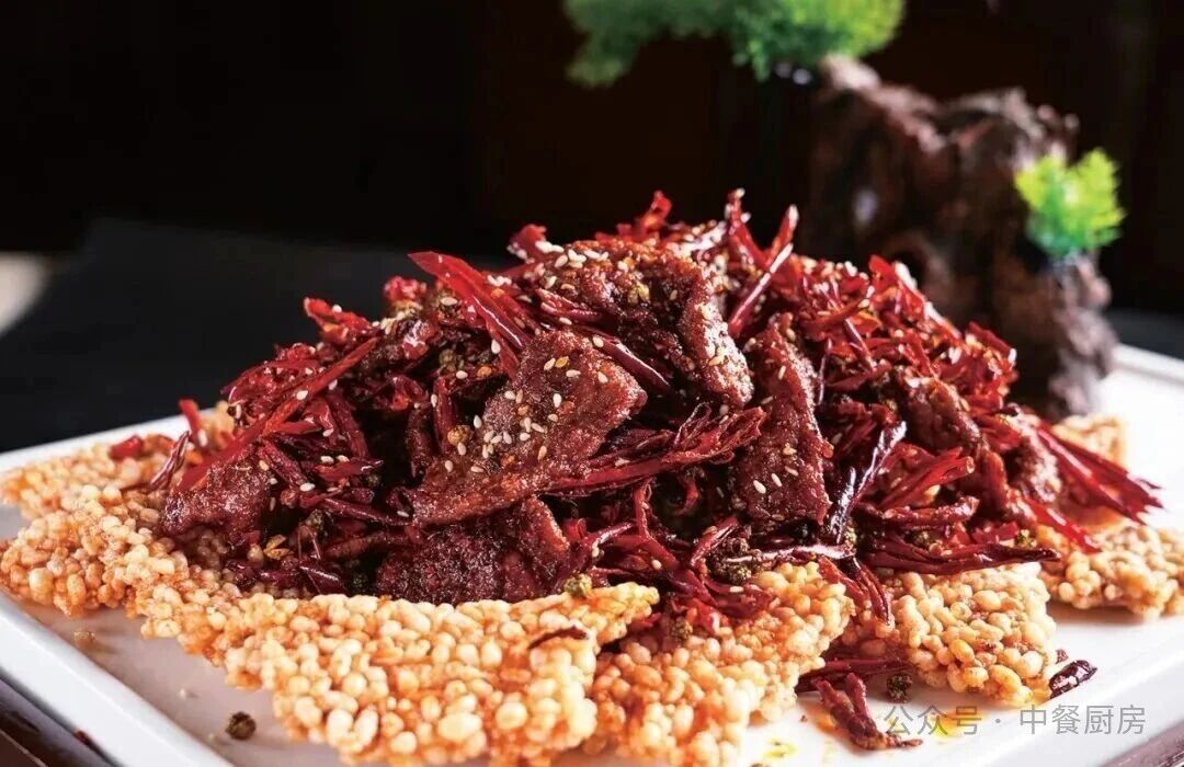 2.锅巴入油锅炸至酥泡,捞出沥油后垫在盘中。锅入油烧热,下牛肉片炒散,加入红油煸至紧皮干香,调入盐、味精、辣椒面、花椒面、孜然粉、白糖炒出颜色和香味再加入辣椒丝同煸至色泽棕红出味,淋入香油,起锅盖在锅巴上即可。