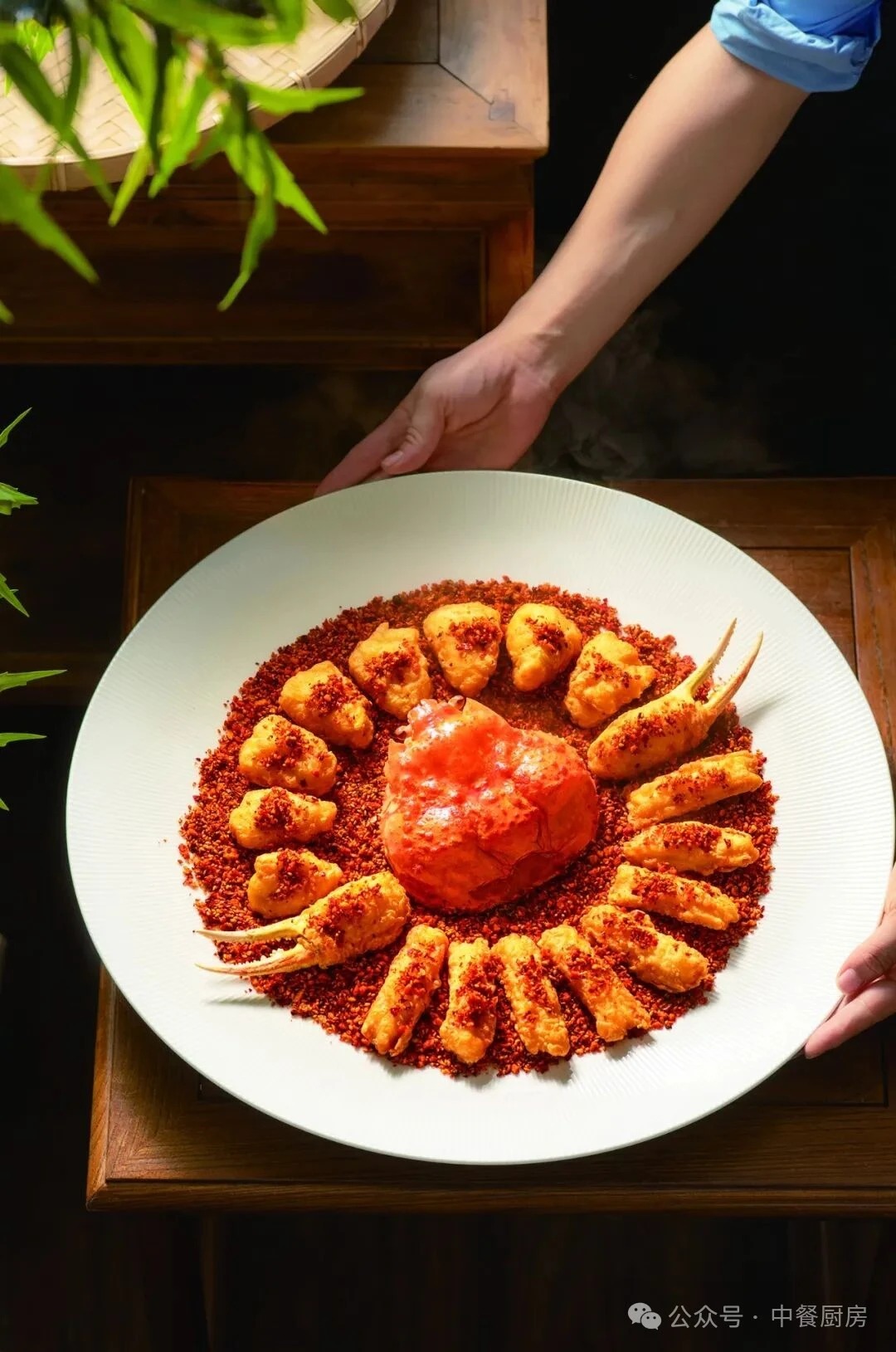 2.锅入油烧热,放入豆瓣、姜米、蒜米炒香出色,再下入刀口椒、花生碎、脆椒碎、芝麻、孜然、花椒面、十三香、鸡精、味精、白糖、盐拌成的辣椒料炒香炒烫,下入炸好的松叶蟹快速翻炒匀,起锅摆盘即成。