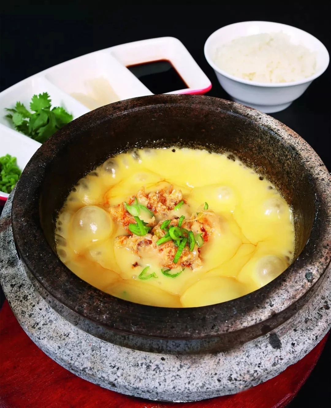 4.上桌时盘里放入干冰,在客人桌上倒入热水,增加气氛。
