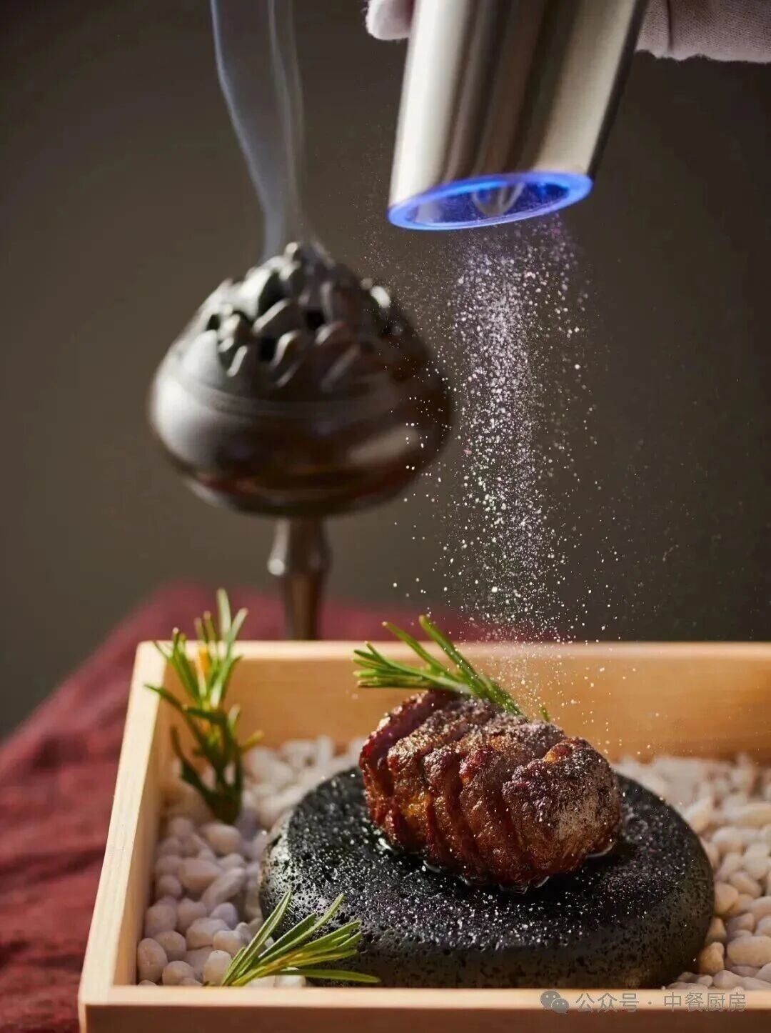 4、木盒放黑色小石子,火山石烤箱200°烤热,放在石子上,摆迷迭香,放上牛肉,青柠檬碎,百里香点缀即可出品