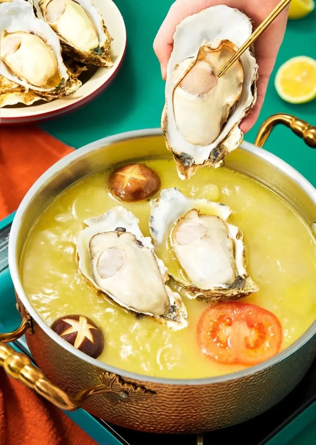 3、生蚝洗净开壳,取出蚝肉。搭配其他食材一同在汤锅中涮熟即可食用。