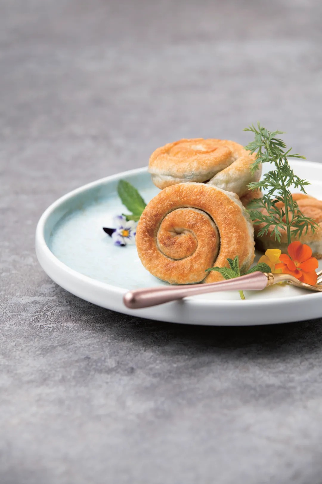 3.取出面团压平后擀成薄面片,放上调好味的小葱,裹住后卷成蜗牛状,接着放入160℃~200℃的煎锅中煎至熟且两面色金黄,沥油后摆盘,稍点缀即可。