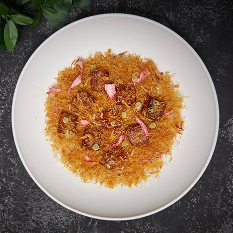 4. 盘中装上炸姜茸,放上猪颈肉,撒上炸红葱碎、炸寿司姜,葱花即可。