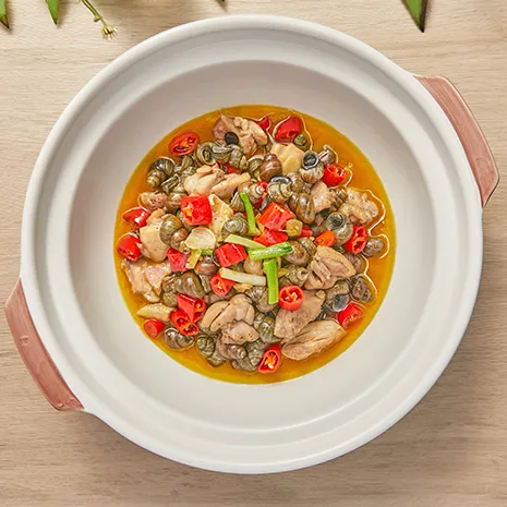 1. 鸡肉加入腌料腌制5分钟后过油沥干备用,螺丝加料酒汆水备用;