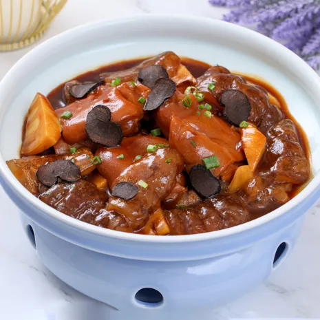 2. 海参改刀成大块,冬笋改刀成角,过油后放入压好的猪手汤汁中一起烧煮入味,汤汁浓稠装盘,刨上黑松露片即可。