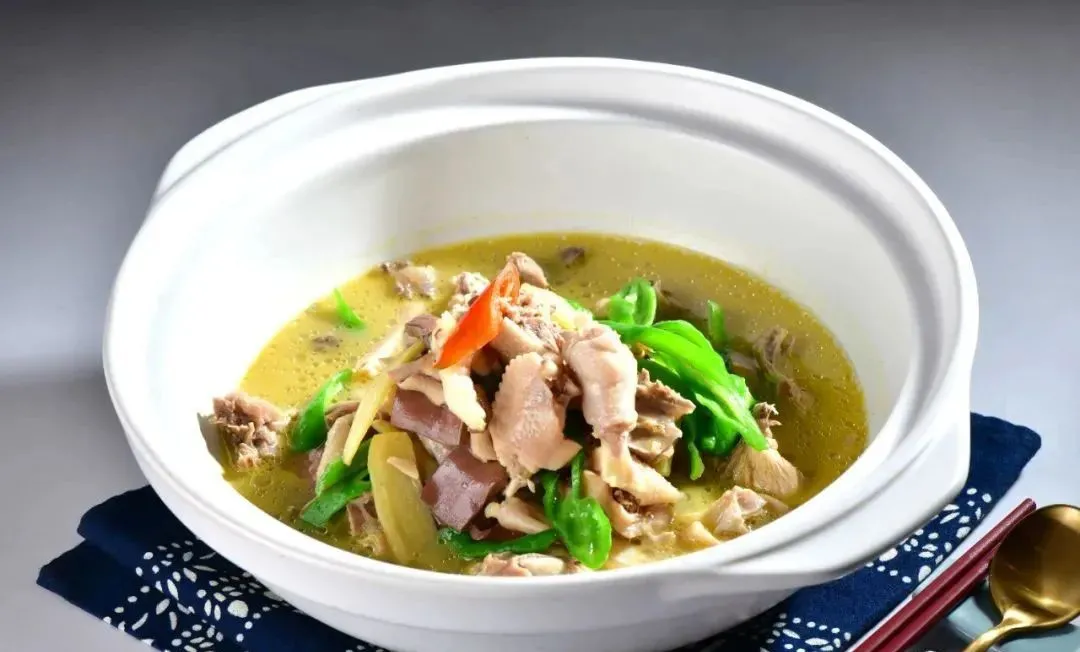 2. 锅上火,放入菜油、猪油、色拉油,待烧至六成热时下姜米、蒜米炒香,再下入小米椒碎、豆瓣酱炒香出色,接着放入豌豆泥、青二荆条辣椒节、香菜节、洋葱丝、芹菜节略炒,加辣妹子酱炒出色后掺入浓汤熬煮20分钟,滤渣后加入鸡精、味精、东古酱油、美极鲜酱油、蚝油调味。