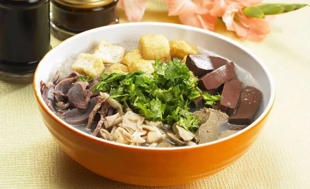 鸭肠清脆爽口,粉丝爽滑,鸭血鲜嫩可口,汤浓味美,香辣醇美,油而不腻,颜色红、白、绿相间,赏心悦目。