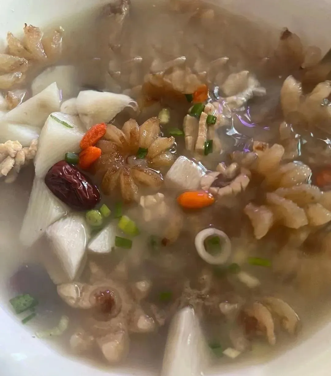 8、牛鞭煮好之后打开锅盖,将红枣放进去 枸杞 山药,还有牛蛋全部都放进去。最后放进去一勺胡椒粉,胡椒粉主要是可以去腥。盖上盖子再次压2分钟左右。