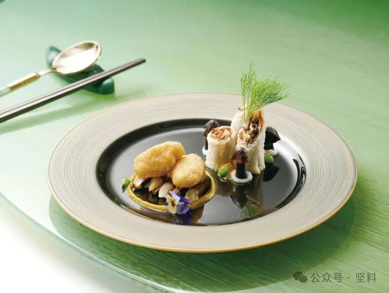 名字取得詩情畫意的甘露竹笙琵琶豆腐,由兩款素菜組合而成。甘露竹笙卷是把竹笙包裹姬松茸、黑皮雞樅菌等餡料,清蒸後佐以南瓜濃汁,入口鮮香細膩。琵琶豆腐利用滑溜的嫩豆腐伴多種菌絲與馬蹄粒酥炸,口感層次分明。