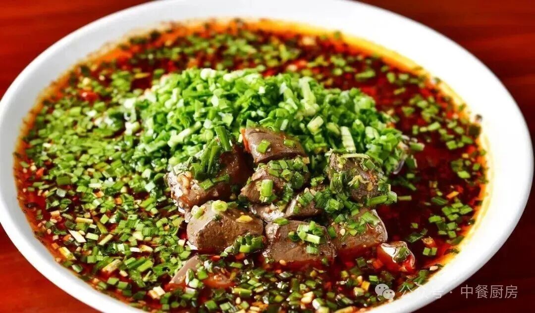 5.净锅入菜油烧热,下入青二荆条辣椒节50 克爆香,舀在盆中,最后淋入藤椒油即成。