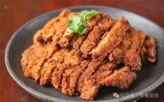 2.净锅入菜籽油烧至六成热,逐一下入牛排生坯,浸炸至表面金黄酥脆且内熟时,捞出来沥油,改刀成条块,装盘即成。