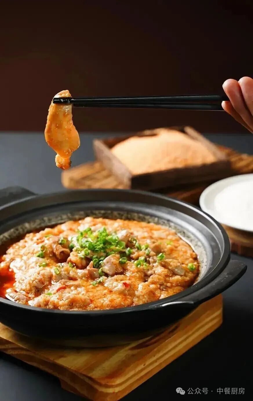 3.将芋儿块放鲜汤锅里煨熟,拣出来放入烧热的铁锅里,随后与长柄瓢里的鸡胗一起上桌。