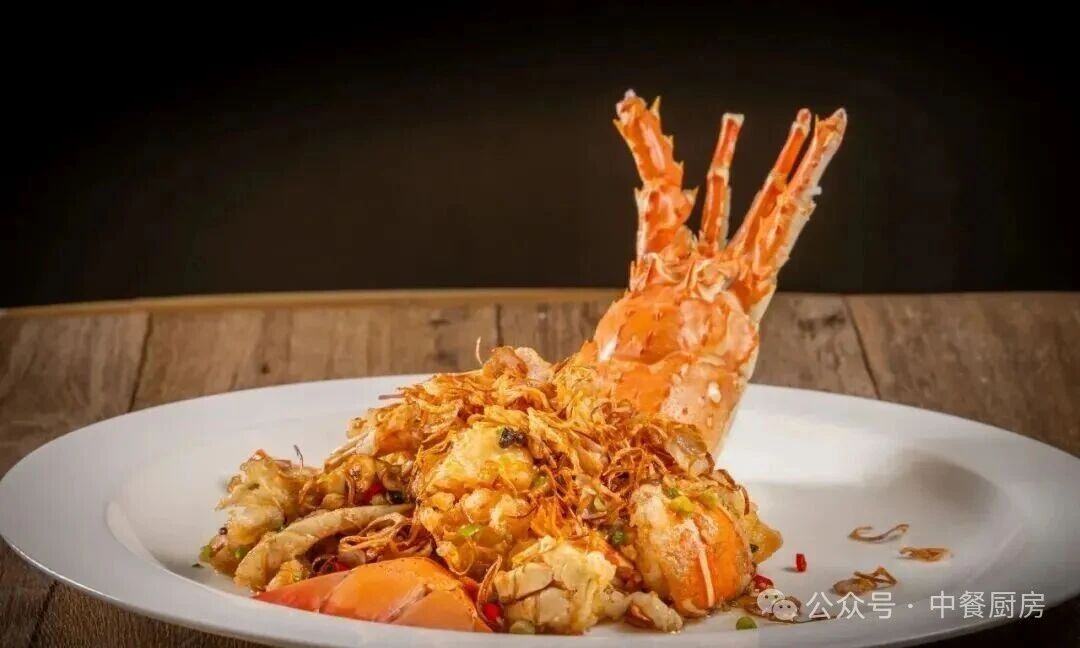 1.大青龙自然解冻后斩下头尾,虾身改刀成块,拍上薄薄一层干淀粉,入六成热油炸至断生、起脆捞出。红葱头切片,入热油炸至金黄,捞出备用。