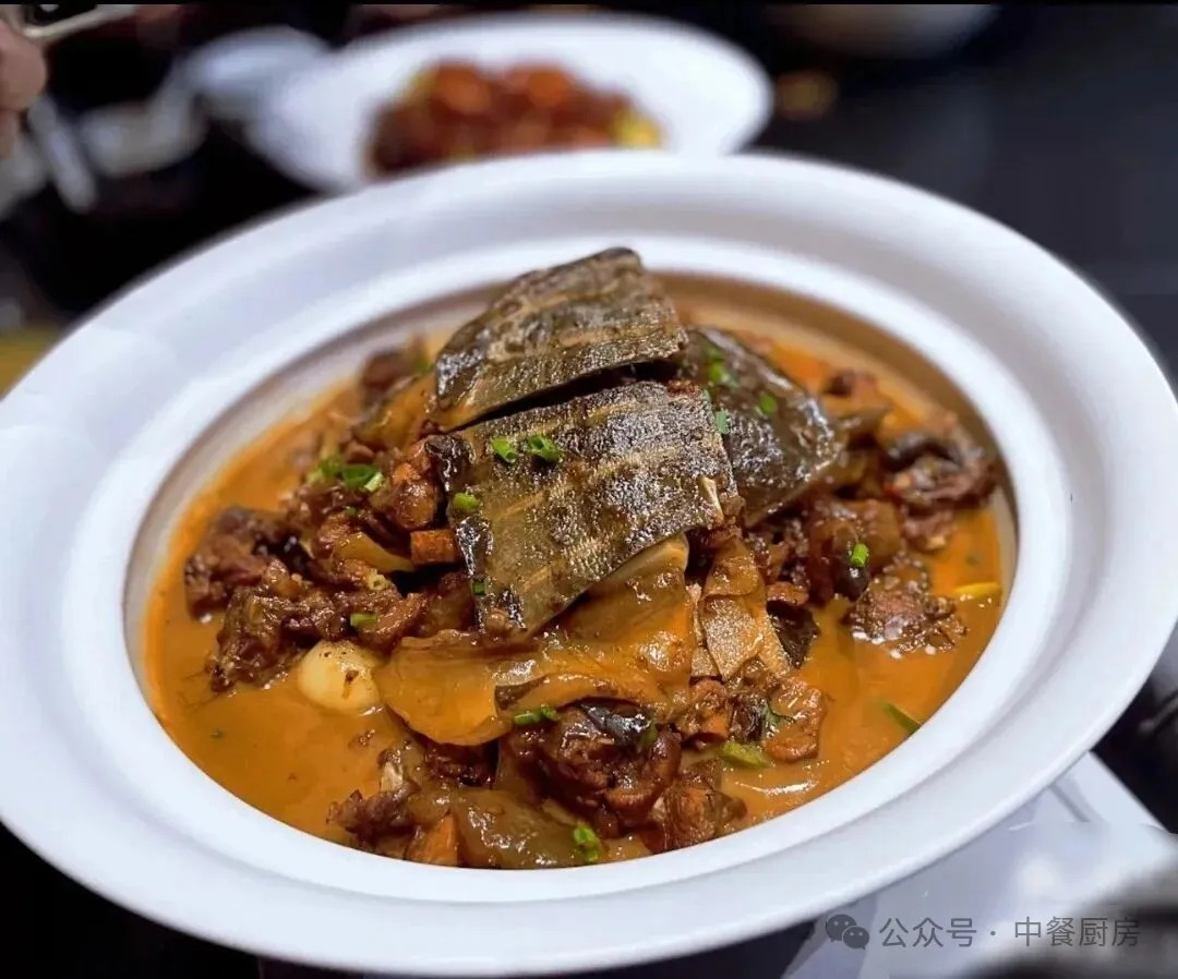 3、锅中再加入25克油,放入马蹄葱、姜米、蒜片、黑椒粒煸香,放入甲鱼翻炒20秒。烹入20克料酒,加入A料,烧5分钟至汤汁收干,淋湿淀粉勾芡,出锅装盘。
