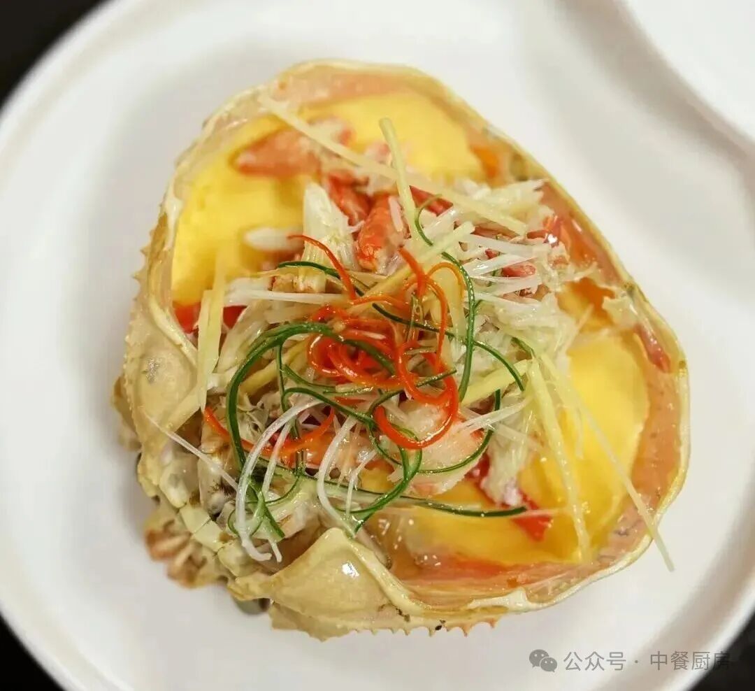 3、鸡蛋打散加入熬好的虾汤搅匀,倒入蟹壳内蒸约6分钟,放蟹肉、葱姜丝,点少许味极鲜用热油激一下即可。