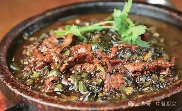2.净锅入菜籽油烧至五六成热,下入牛肉片炒散籽,放入姜米、蒜米、烧椒碎炒出味,然后掺适量鲜汤,调入盐、味精、鸡汁、蚝油、胡椒粉、老抽烧入味,用水淀粉勾芡,出锅装入垫有豆花的石锅内,点缀香菜叶即成。