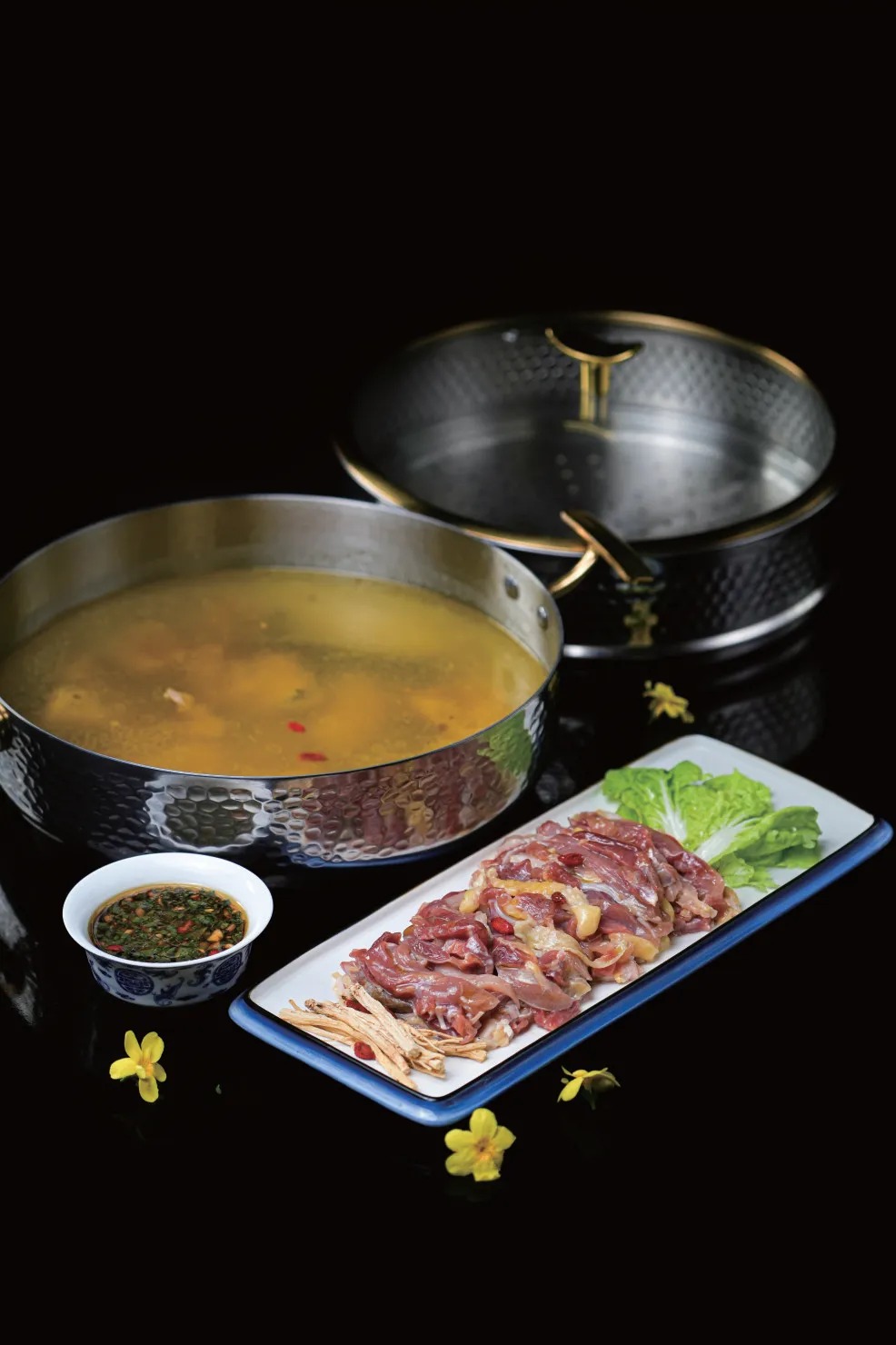 2.把鸡骨下入加有料酒的沸水锅汆去血水,捞出来放入加有姜片、葱节的高压锅里,掺清水,放入山药段,加少许盐、料酒、胡椒粉、味精、枸杞,加盖上火压约10分钟,出锅倒入不锈钢汤锅内成底汤,再加蒸格并垫桑叶,摆放上码好的鸡肉条,上汽后蒸约4 分钟,即可揭盖蘸食鲜辣味汁。